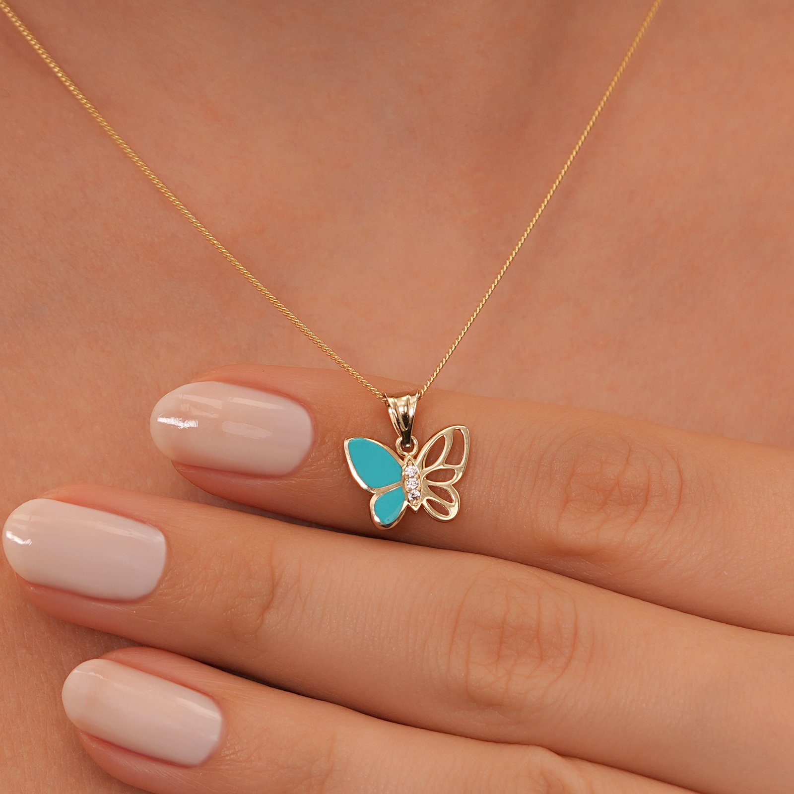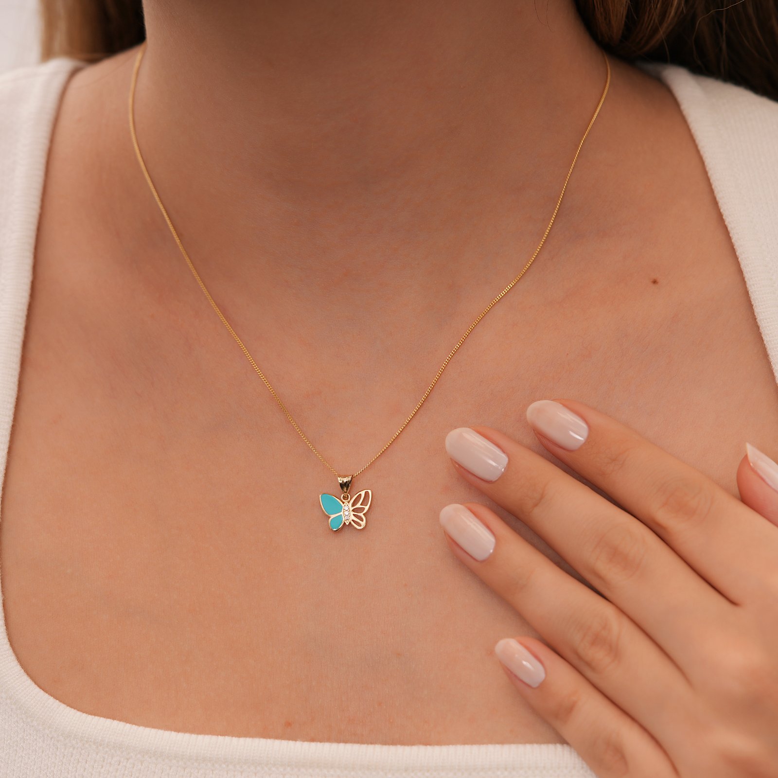Altın Kelebek Kolye – Turkuaz Mineli Minimal Kelebek Kolye